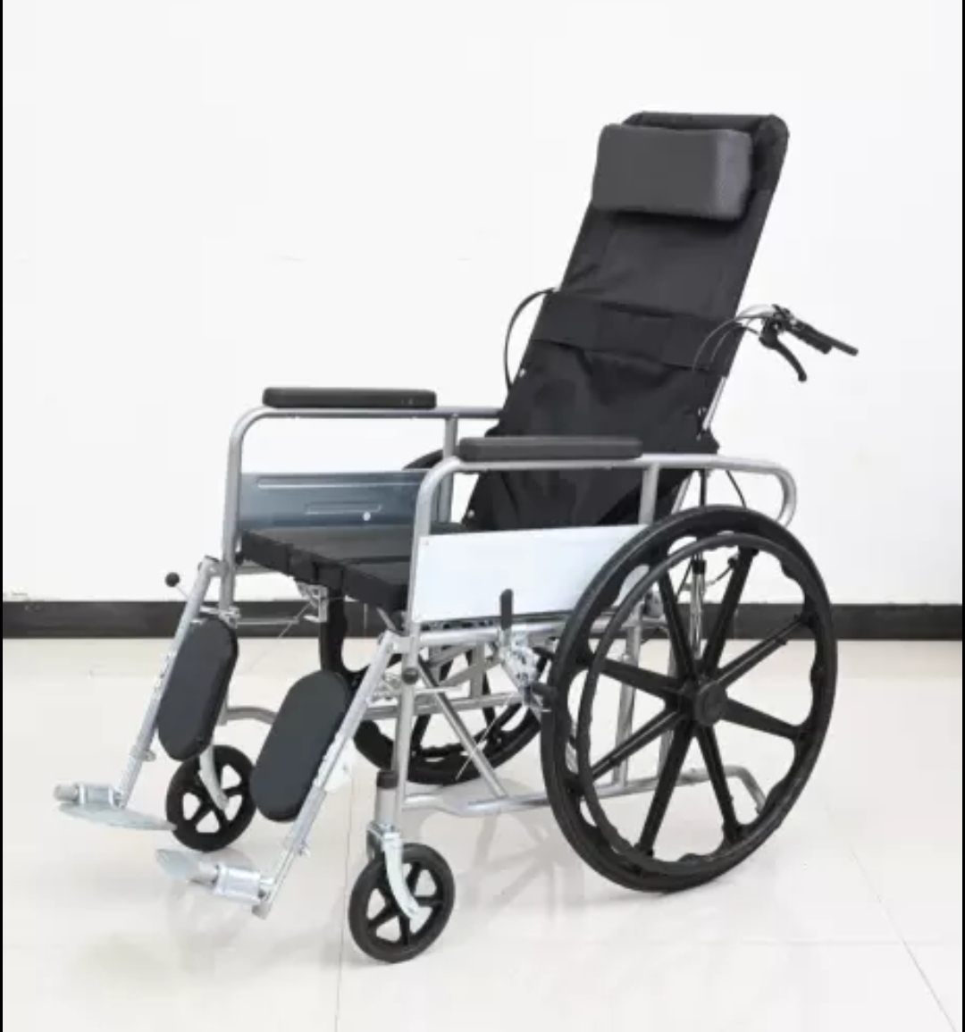 Foldable, aluminum frame, full recliner wheelchair with extended back/headrest.