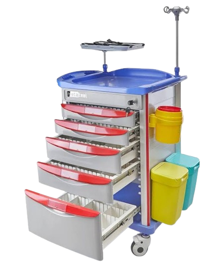 Emergency Crash Cart Trolley 5 drawers (high strength alloy ABS boards, complete with all accessories- i.e S/S Guard rail ,CRP board, monitor holder, dust basket, file bin,O2 cylinder holder, needle disposal container, iv pole,